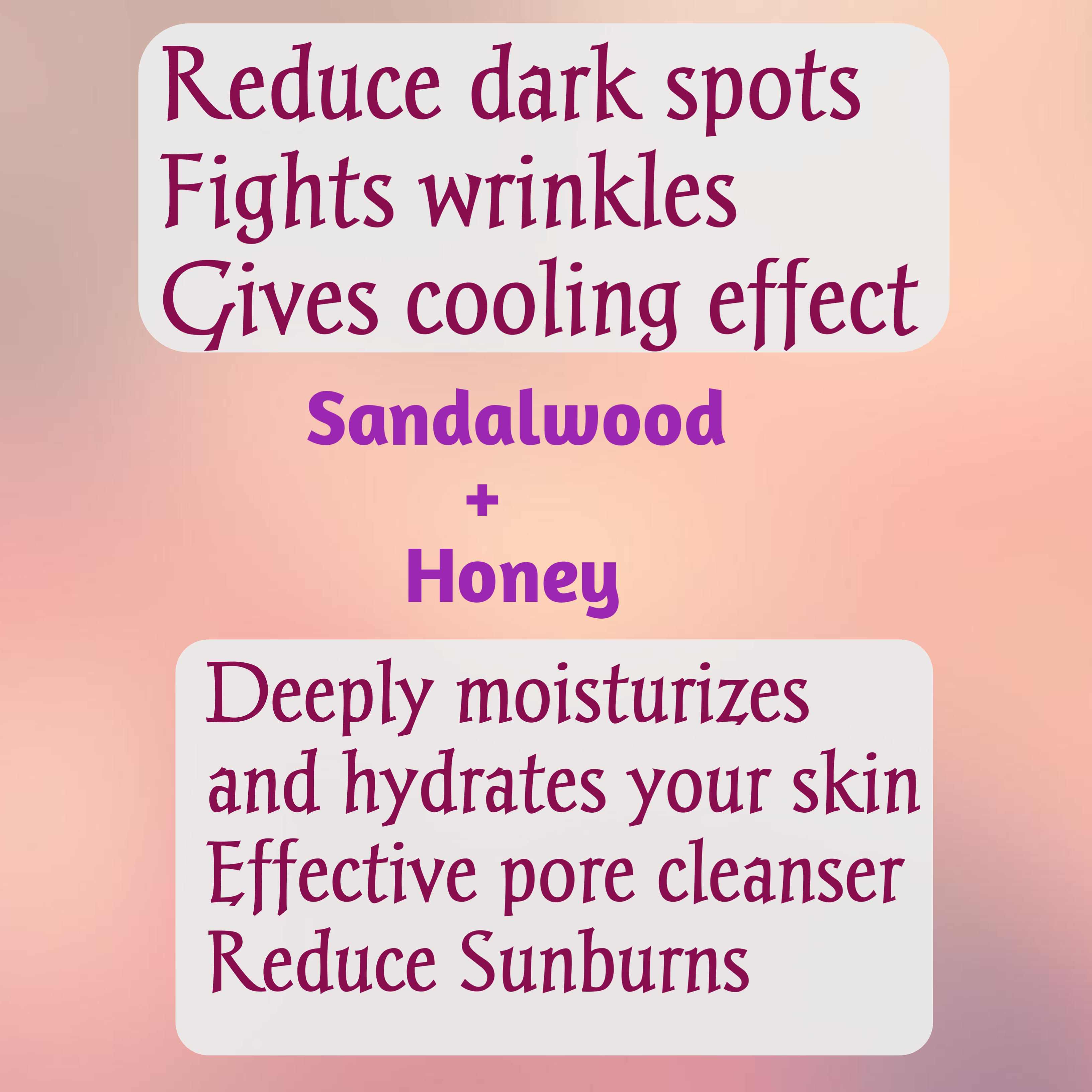 Benefits: Gives cooling effect naturally as it contains pure sandalwood. Rejuvenate skin, control excess oil, makes skin light & bright. Perfect oil balance between sandalwood and honey gives your skin a smooth touch.